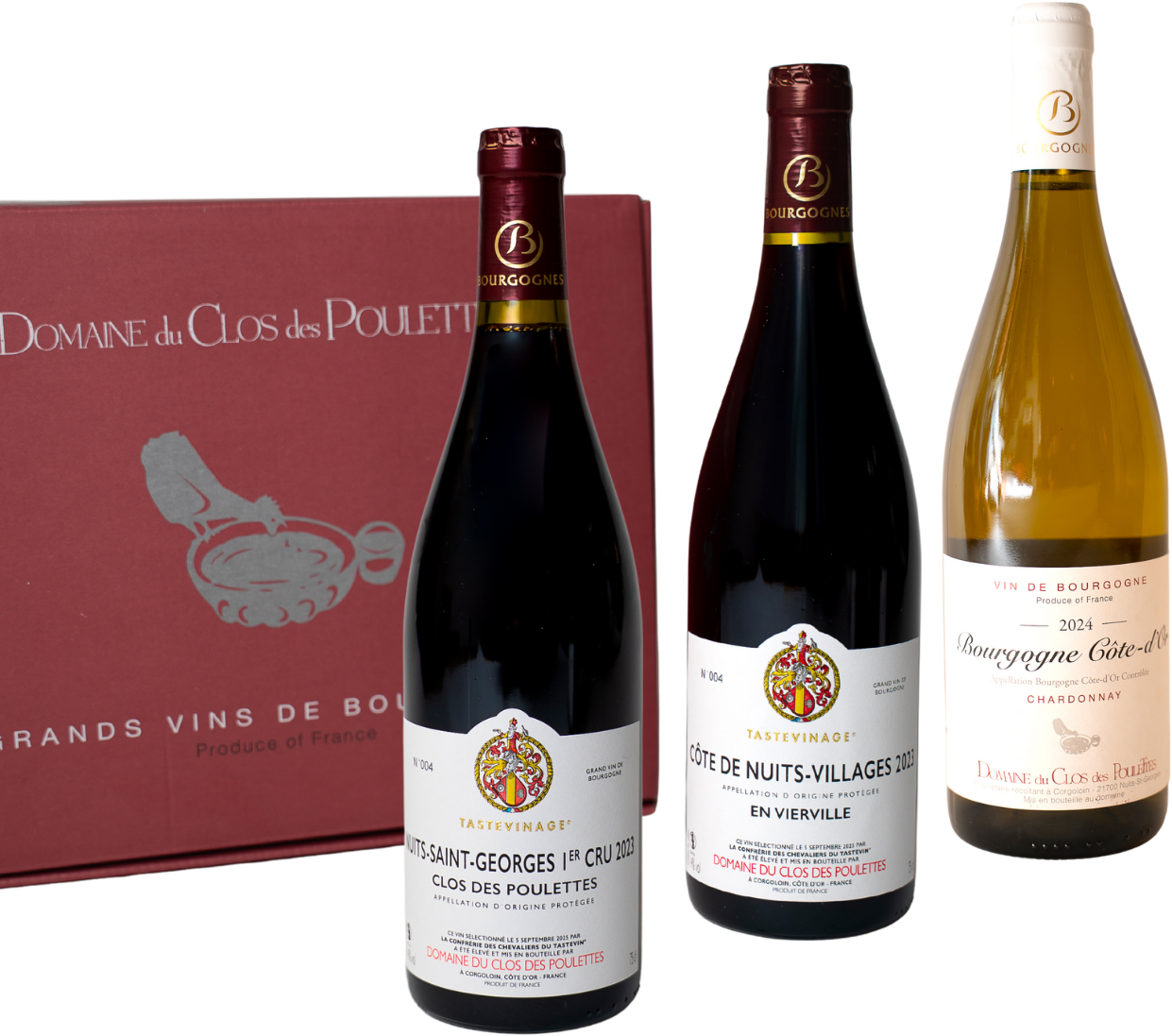 Parcourez notre sélection, faites vous plaisir avec les Côte de Nuits Tastevinés (12 bouteilles de Côte de Nuits VIllages rouge, 6b. 2022 et 6b. 2023) ou partez à la découverte des délicieux Trésors de la Côte de Nuits (2 Bourgogne Côte d'Or Blanc, 2 Côte de Nuits Villages rouge 2023 tastevinés, 2 Nuits Saint Georges 1er Cru 2023 Tastevinés)